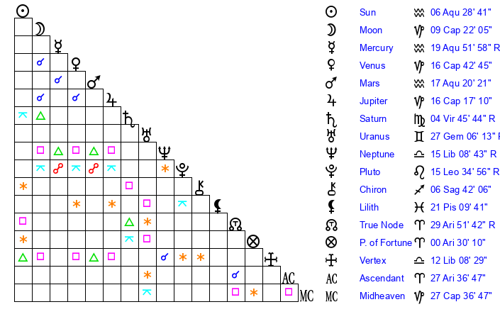 | Mercury | 19 Aquarius 51 | 27 Capricorn 48 | 21 Aries 52 |