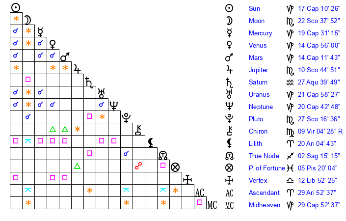 Moon | 22 Scorpio 41 | 27 Aries 1 | 13 Capricorn 52 |