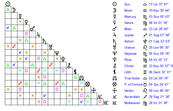 | Pluto | 5 Virgo 19 | 1 Aquarius 21 | 6 Virgo 8 |