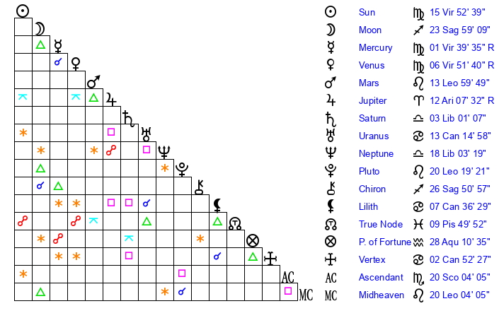 Mercury | 1 Virgo 39 | 13 Virgo 10 | 19 Sagittarius 51 |