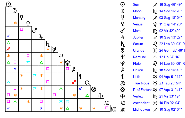 | Moon | 14 Scorpio 10 | 21 Leo 57 | 20 Virgo 0 |