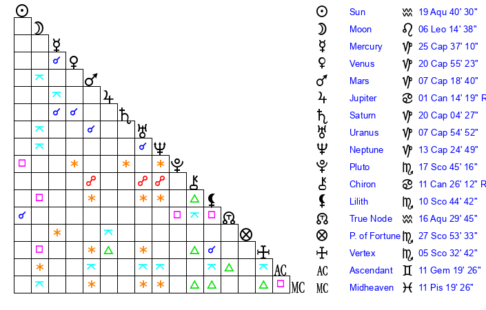 | Mars | 7 Capricorn 19 | 18 Cancer 33 | 3 Aquarius 0 |