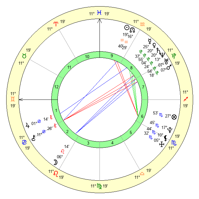 | Moon | 6 Leo 13 | 3 Cancer 23 | 12 Scorpio 8 |