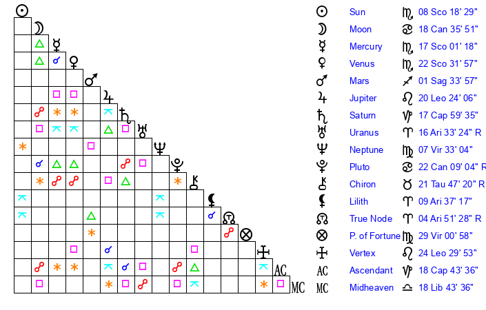 | Moon | 18 Cancer 32 | 16 Pisces 41 | 8 Capricorn 35 |