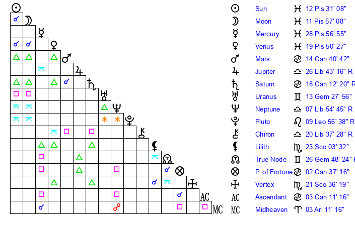 | Neptune | 7 Libra 55 | 28 Pisces 59 | 6 Libra 1 |