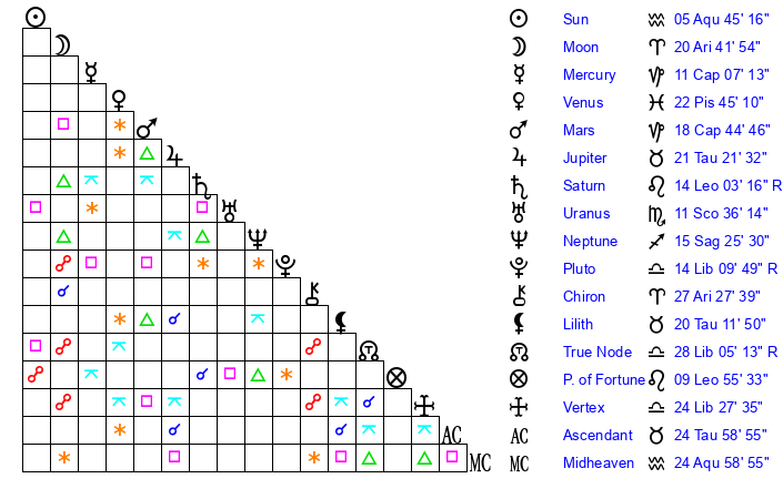 | Sun | 5 Aquarius 45 | 6 Aquarius 6 | 24 Pisces 7 |