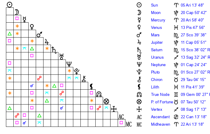 | Moon | 20 Capricorn 47 | 14 Aquarius 24 | 9 Cancer 50 |