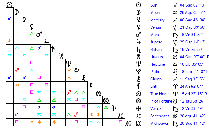 | Moon | 26 Aquarius 12 | 15 Aquarius 58 | 3 Sagittarius 35 |