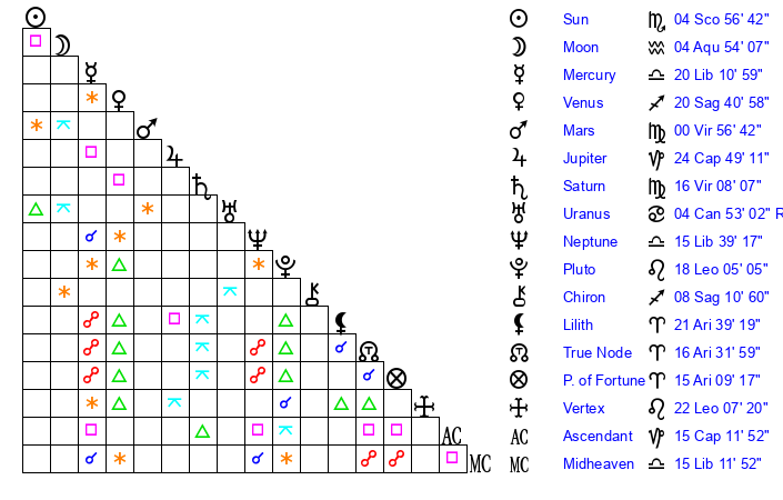 | Sun | 4 Scorpio 57 | 5 Scorpio 31 | 21 Capricorn 56 |