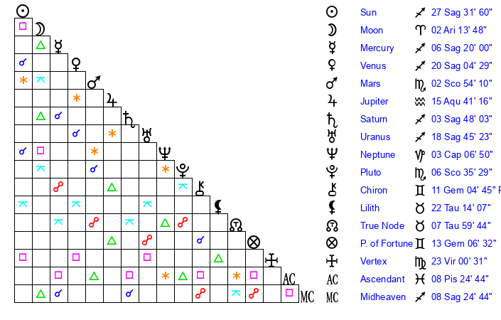 | Sun | 27 Sagittarius 32 | 28 Sagittarius 5 | 7 Aquarius 15 |