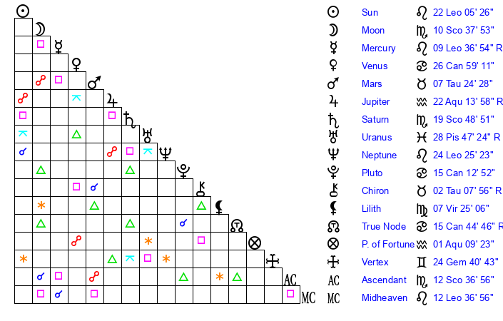 | Mercury | 9 Leo 36 | 5 Leo 23 | 7 Sagittarius 13 |