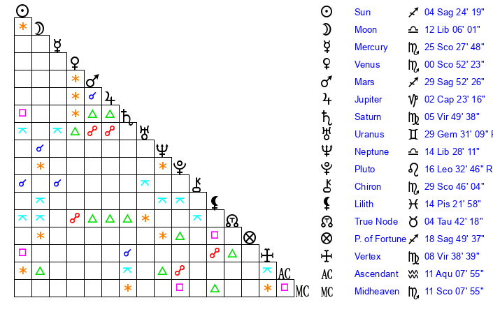 Sun | 4 Sagittarius 24 | 4 Sagittarius 58 | 21 Aquarius 41 |