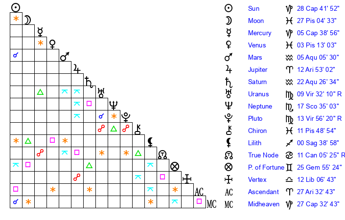 Saturn | 22 Aquarius 40 | 16 Pisces 5 | 29 Aquarius 50 |