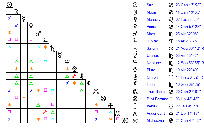 | Sun | 26 Cancer 18 | 27 Cancer 16 | 26 Virgo 2 |