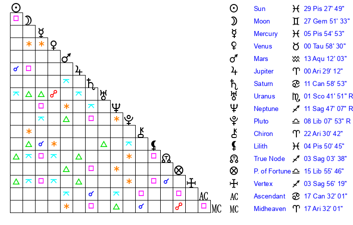 | Moon | 27 Gemini 54 | 10 Sagittarius 10 | 29 Aries 59 |