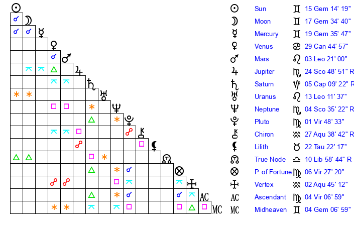 | Mercury | 19 Gemini 36 | 25 Gemini 22 | 8 Leo 39 |