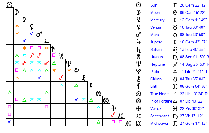 | Sun | 26 Gemini 22 | 26 Gemini 45 | 12 Leo 11 |