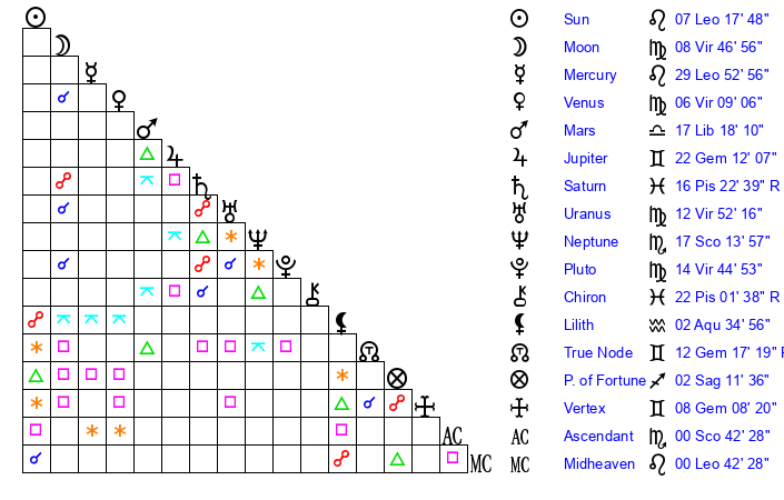 | Venus | 6 Virgo 10 | 29 Gemini 28 | 17 Scorpio 22 |