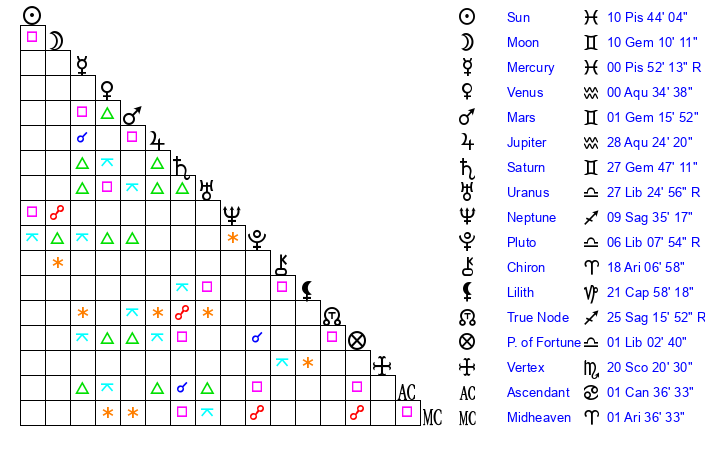| Mercury | 0 Pisces 51 | 27 Pisces 26 | 17 Aries 27 |