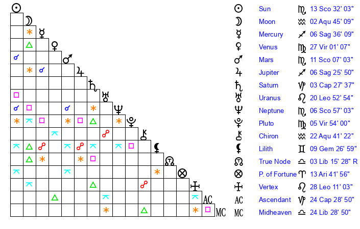 | Sun | 13 Scorpio 32 | 14 Scorpio 32 | 20 Capricorn 29 |