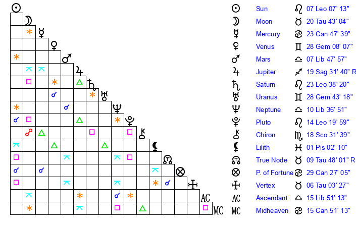 | Moon | 20 Taurus 34 | 14 Libra 25 | 22 Pisces 18 |