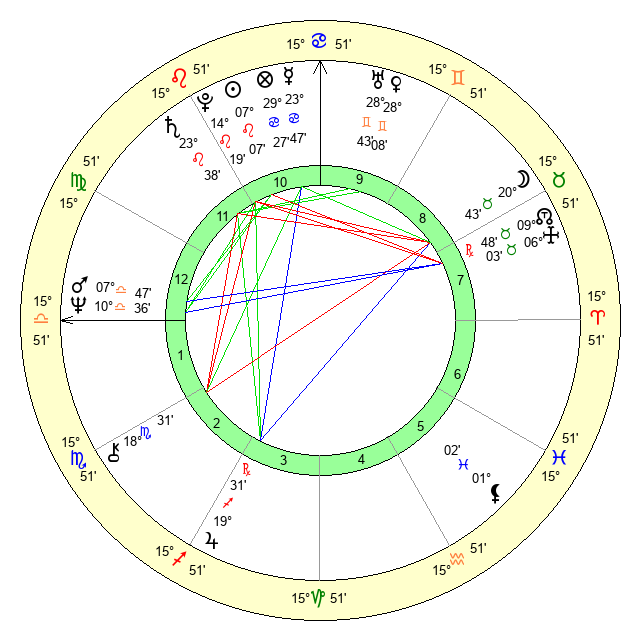 | Mercury | 23 Cancer 48 | 10 Leo 10 | 1 Scorpio 50 |