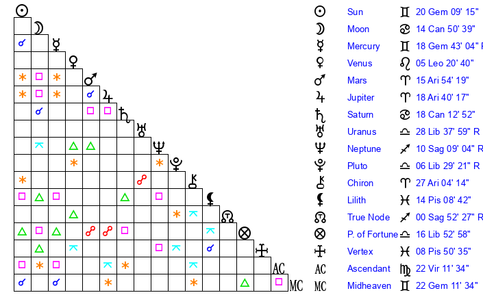 | Sun | 20 Gemini 9 | 21 Gemini 1 | 7 Leo 51 |