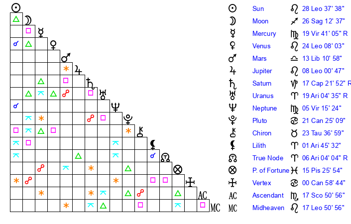 | Sun | 28 Leo 37 | 29 Leo 51 | 1 Sagittarius 27 |