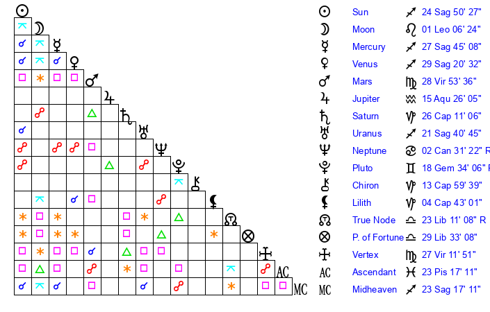 | Uranus | 21 Sagittarius 38 | 28 Taurus 24 | 25 Sagittarius 26 |