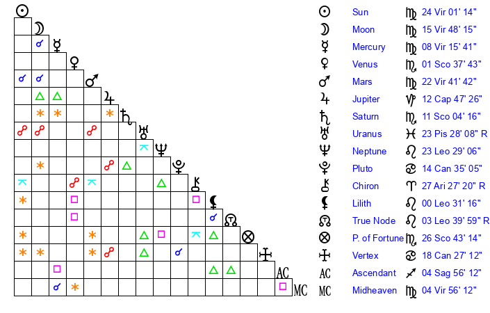 | Sun | 24 Virgo 2 | 24 Virgo 49 | 4 Capricorn 11 |
