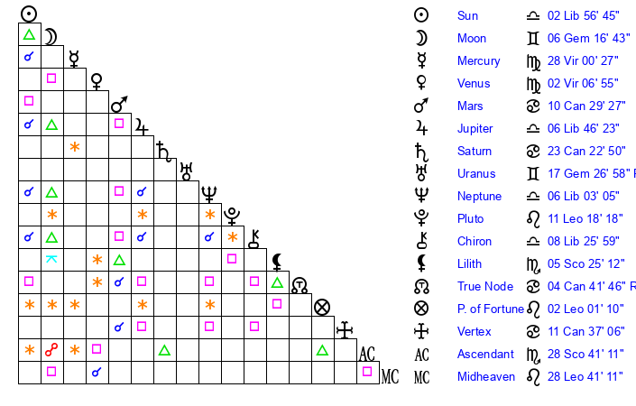 | Mars | 10 Cancer 29 | 2 Scorpio 45 | 2 Leo 28 |