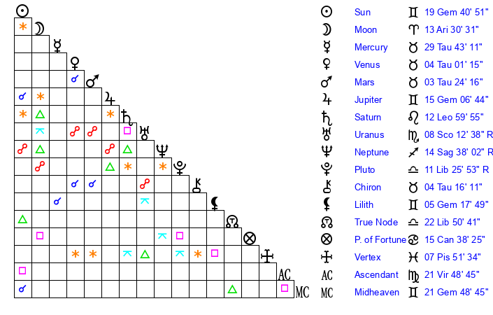 | Neptune | 14 Sagittarius 37 | 2 Aries 0 | 13 Sagittarius 34 |