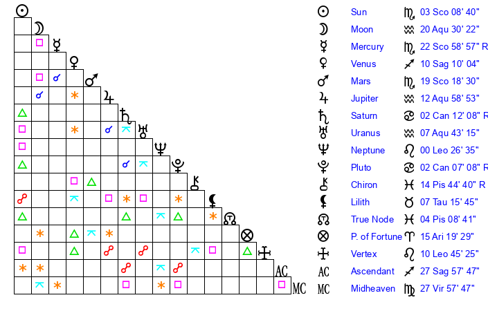 | Mercury | 22 Scorpio 58 | 27 Scorpio 49 | 7 Pisces 30 |