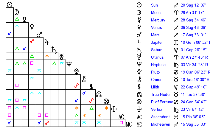 | Sun | 20 Sagittarius 12 | 20 Sagittarius 55 | 27 Pisces 23 |
