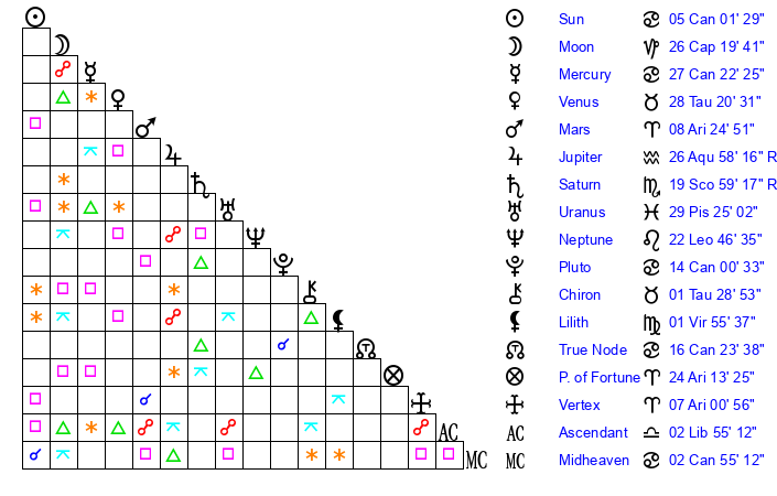 | Pluto | 14 Cancer 1 | 3 Aquarius 12 | 15 Cancer 55 |