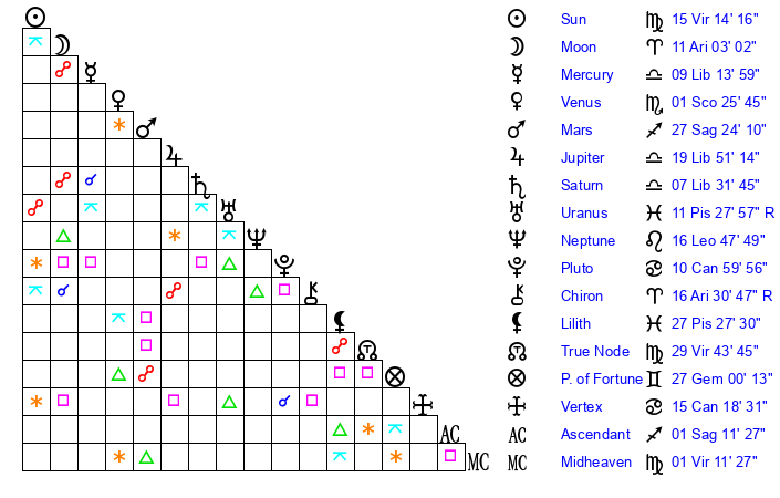 | Sun | 15 Virgo 14 | 16 Virgo 18 | 28 Sagittarius 3 |