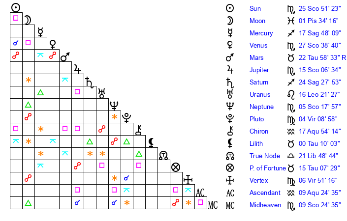 | Sun | 25 Scorpio 51 | 26 Scorpio 36 | 3 Aquarius 58 |