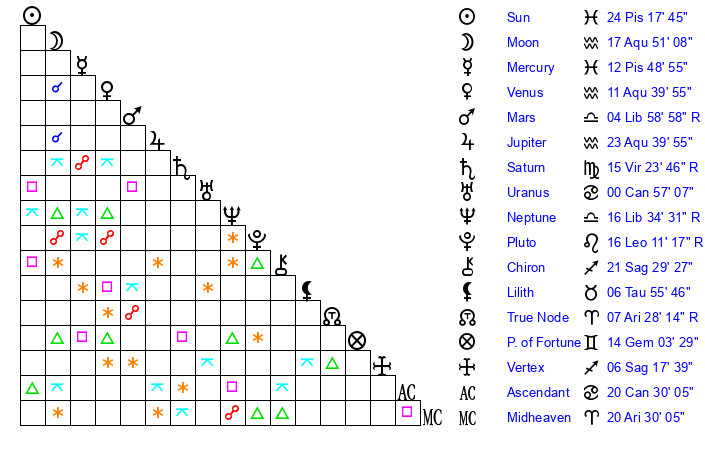 | Sun | 24 Pisces 18 | 25 Pisces 7 | 7 Gemini 30 |