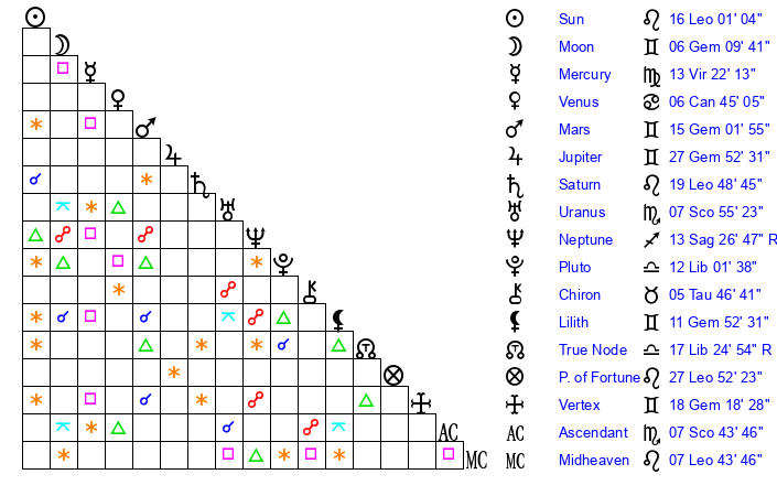 | Uranus | 7 Scorpio 59 | 1 Gemini 8 | 9 Scorpio 48 |