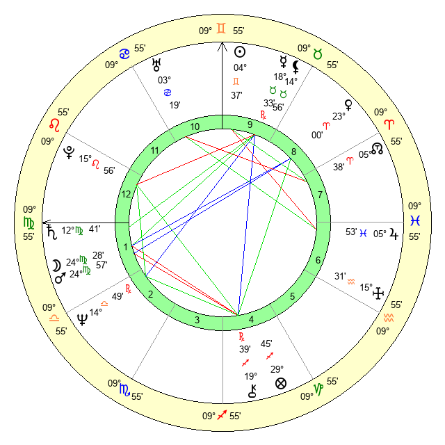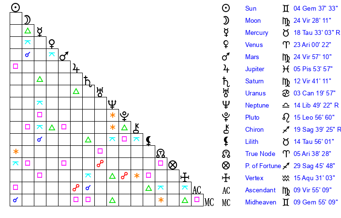 | Moon | 24 Virgo 30 | 26 Taurus 3 | 26 Gemini 8 |