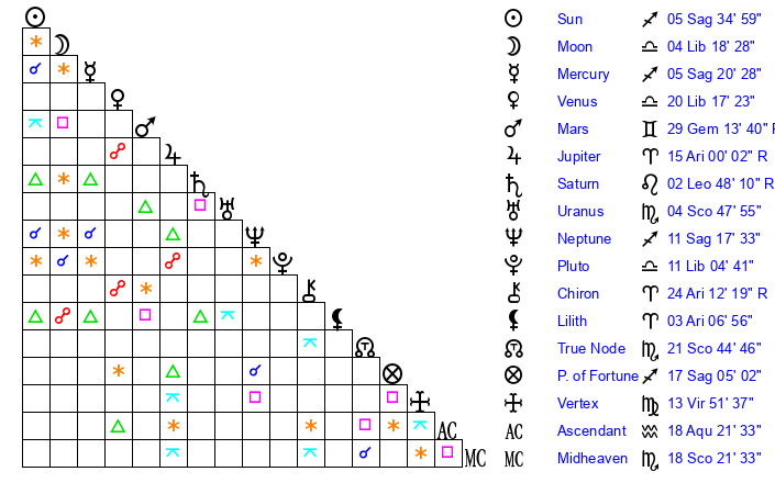 | Mars | 29 Gemini 14 | 17 Sagittarius 25 | 14 Gemini 48 |