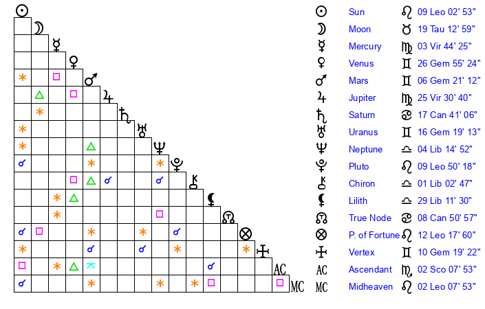 | Moon | 19 Taurus 7 | 11 Scorpio 41 | 19 Aries 22 |