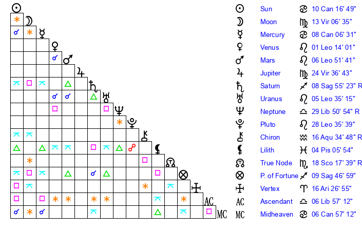 Moon | 13 Virgo 8 | 7 Libra 0 | 7 Pisces 24 |