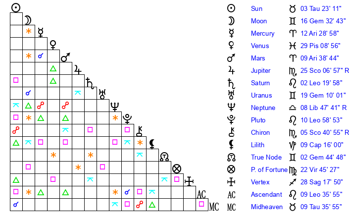 | Moon | 16 Gemini 35 | 17 Pisces 2 | 17 Aries 38 |