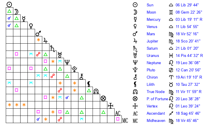 | Saturn | 21 Libra 35 | 27 Pisces 40 | 2 Scorpio 4 |