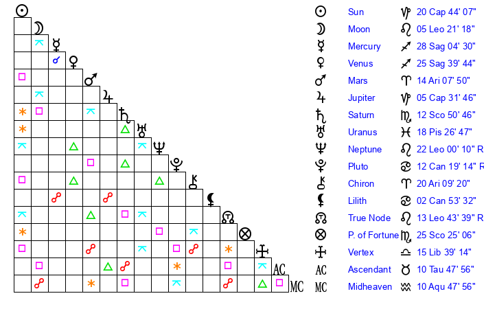 | Neptune | 21 Leo 59 | 27 Pisces 28 | 19 Leo 48 |