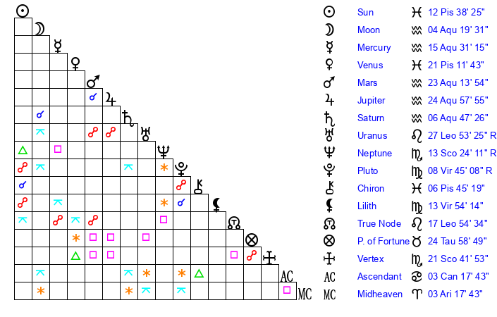 | Saturn | 7 Aquarius 3 | 20 Pisces 57 | 11 Aquarius 27 |