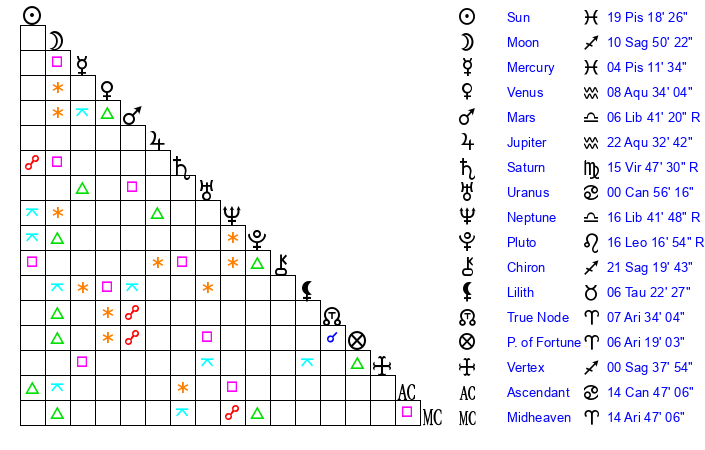 | Saturn | 16 Virgo 21 | 21 Pisces 47 | 13 Virgo 11 |