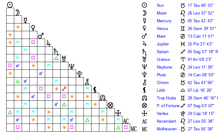| Sun | 17 Taurus 49 | 19 Taurus 5 | 21 Leo 37 |
