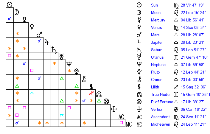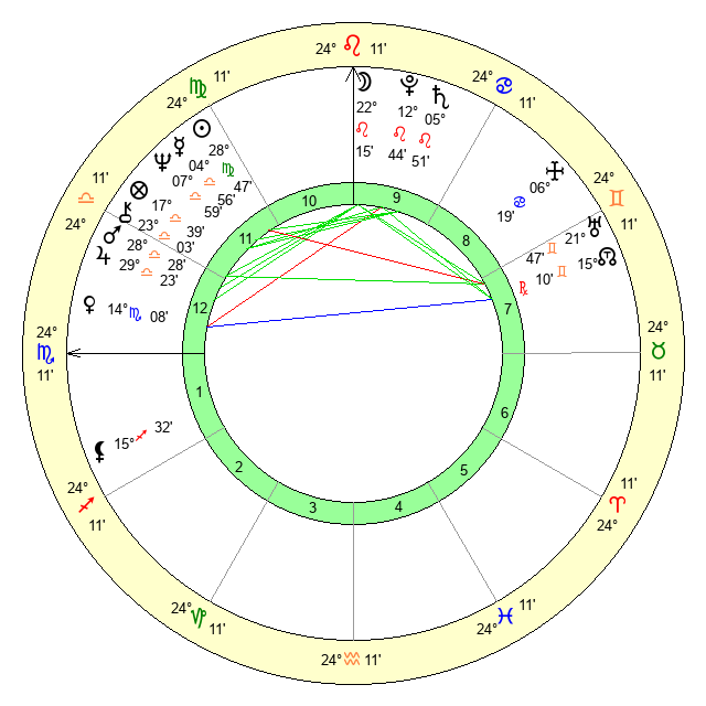 | Moon | 22 Leo 9 | 6 Libra 12 | 11 Cancer 18 |